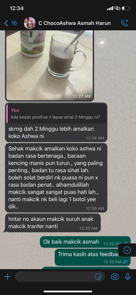 Kesan dari Makanan Sunnah (Kurma, Kismis, ) yang digunakan didalam Choco Ashwa membantu membekalkan tenaga tambahan dan Dengan Gabungan Ashwaganda serta Sacha Inchi akan membantu menguatkan ingatan minda dan mengelakkan dari penyakit Dimensia (Nyanyuk), Selepas amalkan Botol yang pertama, akak akan mula rasa badan makin bertenaga dan minda semakin cergas.